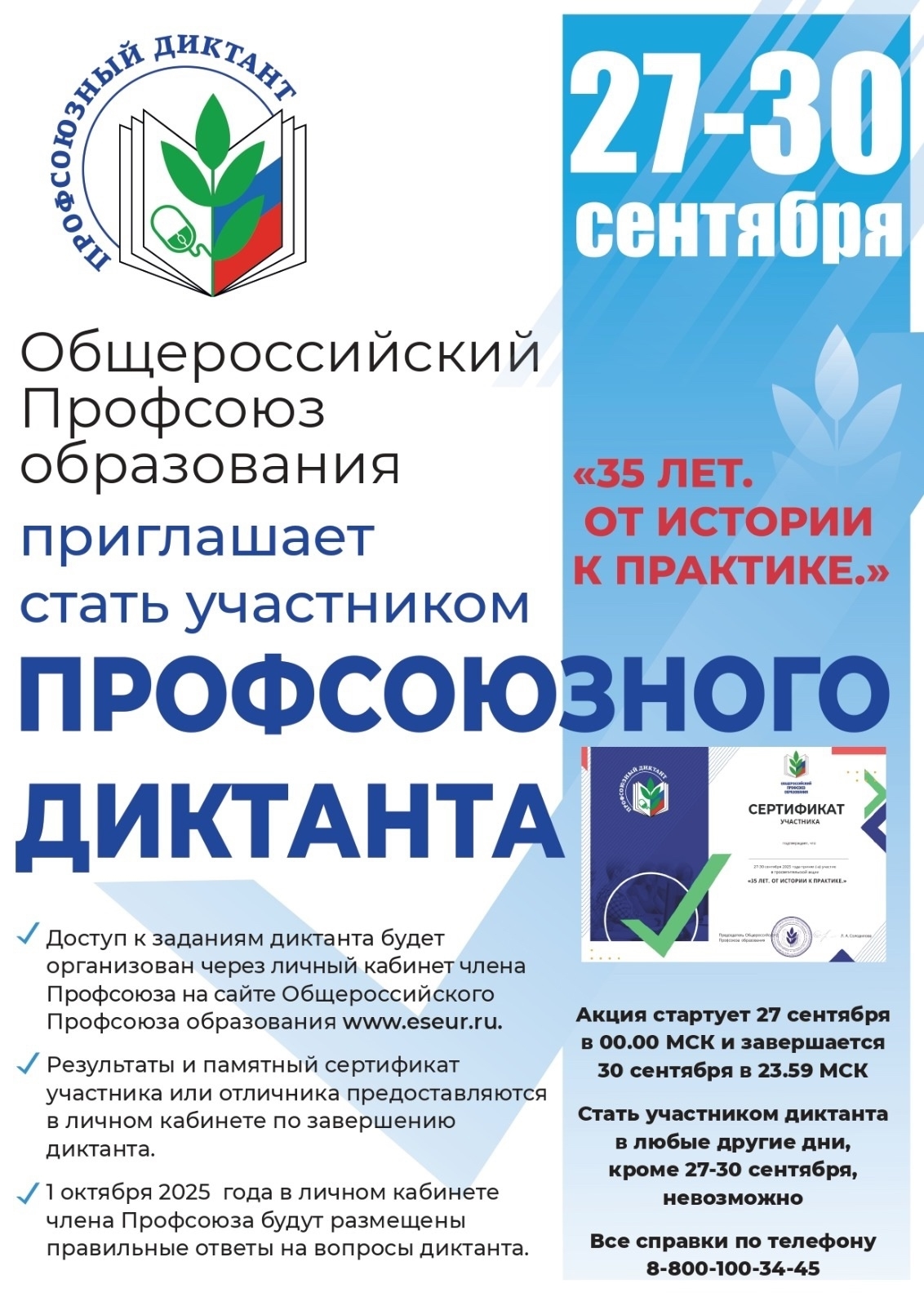 Общероссийский Профсоюз образования проводит просветительскую акцию «Профсоюзный диктант «35 лет. От истории к практике»
